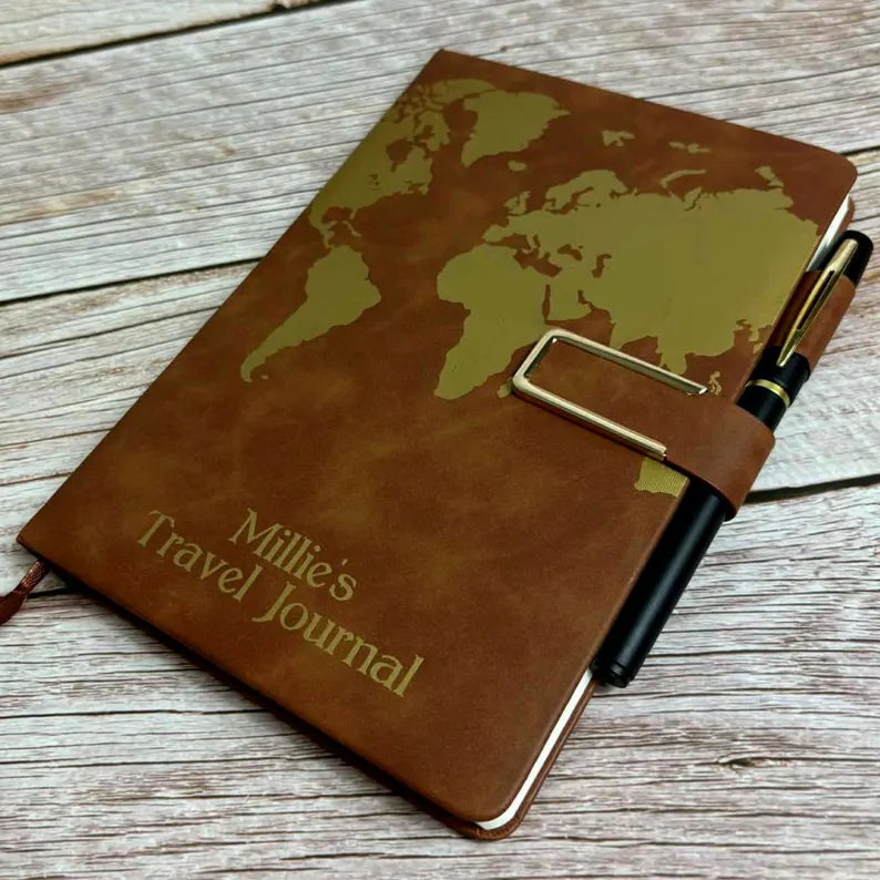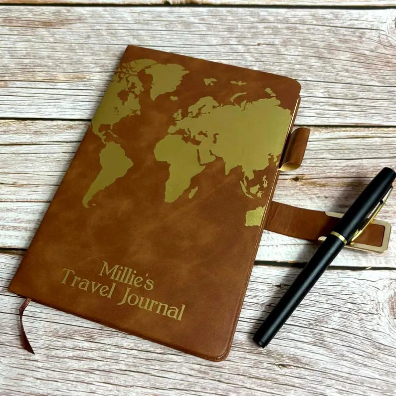 Personalised Gold Travel Journal Diary, A5 Notebook, Pen Holder, Page Marker, Hardback, Magnetic Closure, Sewn Bound 200 Pages, World Map